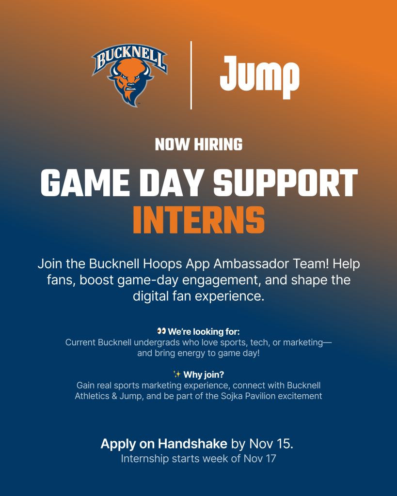 Bucknell basketball, game day interns! posted on November 10, 2025 Apply on Handshake by November 15.