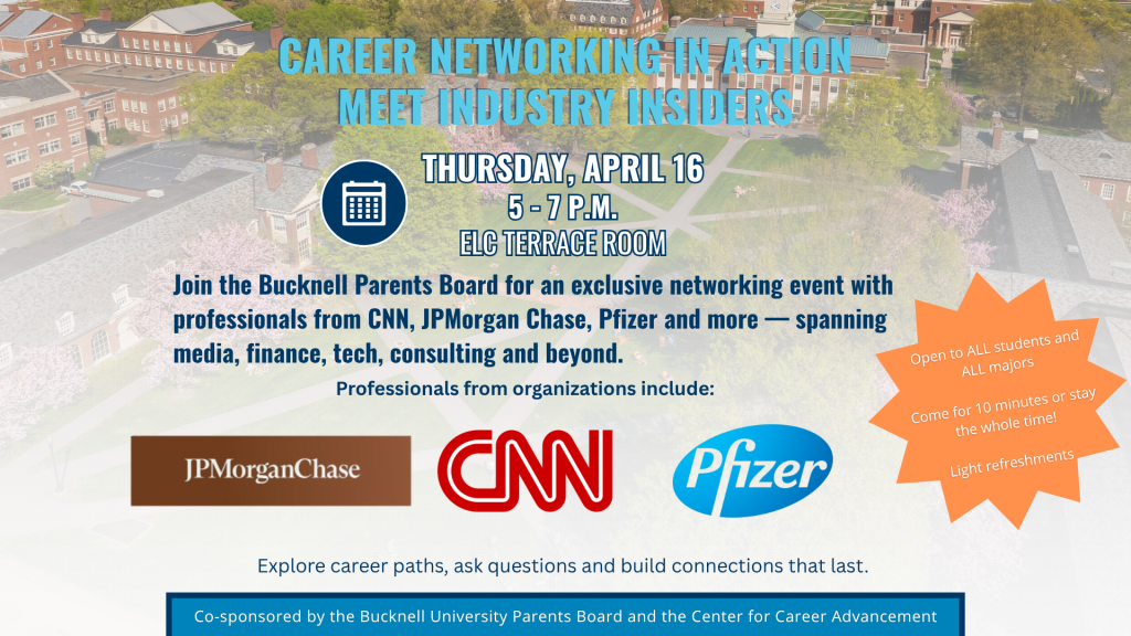 Career Networking in Action posted on April 6, 2026 Join the Bucknell Parents Board Thursday, April 16th from 5-7pm in the ELC Terrace Room for this exclusive networking event.