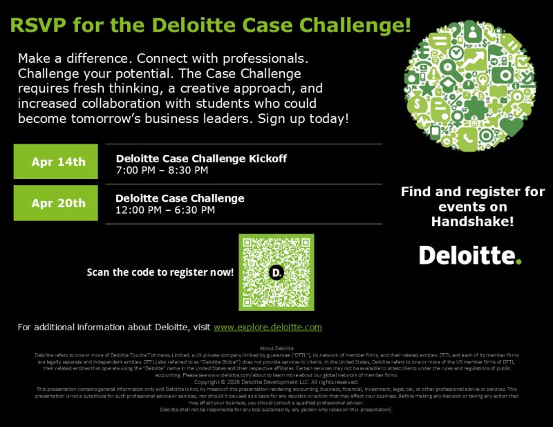 Interested in gaining some real-world consulting experience? Check out the Deloitte Case Challenge starting on 4/14. This is a great opportunity to gain industry experience and connect with Deloitte professionals (and fellow Bucknell alumni). All class years and majors are welcome! Register here and attend the kickoff to participate – https://lnkd.in/eXGa3r2g.