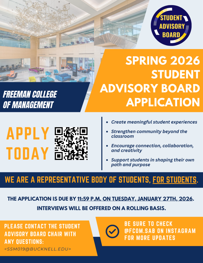 The Student Advisory Board is a representative body of students, for students, within the Freeman College of Management. The Board cultivates student experiences through strategic initiatives to foster community inside and outside the classroom. Enhancing the community provides a platform for individuals to connect, collaborate, and create their own unique path and purpose.