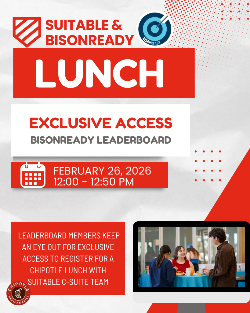 As an added bonus, students who are currently on the Suitable leaderboard will have an exclusive opportunity to attend a Chipotle lunch with the Suitable team. Learn everything from how to start up an organization (as three twenty-somethings) to how to maximize your engagement and professional development through the Suitable platform.