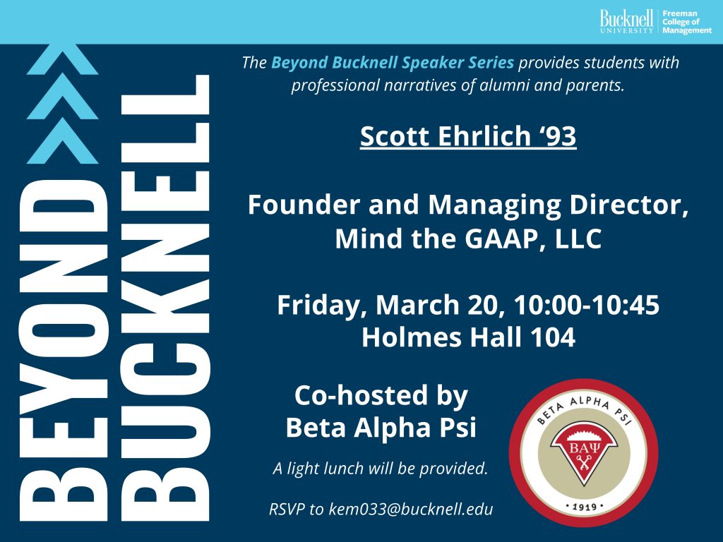 Beyond Bucknell: Scott Ehrlich ’93 on March 20th posted on March 11, 2026 Come join us for this Beyond Bucknell session with Scott Ehrlich ‘93, Founder and Managing Director, Mind the GAAP, LLC on March 20th from 10:00-10:45am in Holmes Hall 104. This event is in collaboration with Beta Alpha Psi.
