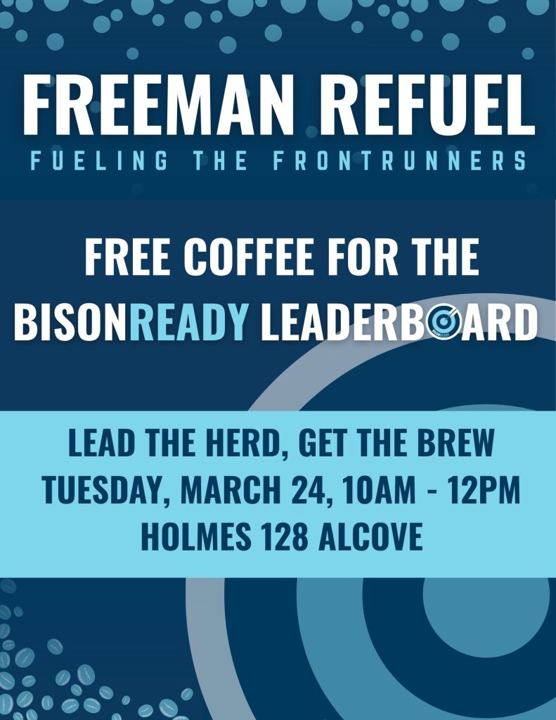 Are you one of the leaders on BisonReady? Stop by the Holmes 128 Alcove and grab some coffee as a treat for all of the hard work that you have been doing. We see you and how you are engaging.